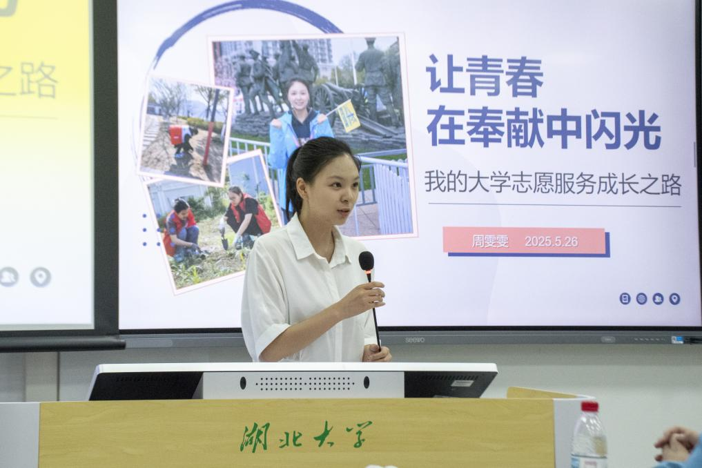 2021级地理科学(师范)专业周雯雯,分享了如何将志愿服务与专业发展相结合的心得。作为前公司团委副书记和第27届研究生支教团团长,在校期间,她不仅积极参与沙湖环保志愿队、红十字急救培训等公益实践,同时注重专业能力提升,先后考取教团队格证、参与地理学科竞赛并完成专业实习。谈及选择支教保研的初衷,她表示:“因为热爱所以选择”。在分享成长历程时,周雯雯以自身经历为例,建议学弟学妹们通过课堂研讨、科研项目、专业竞赛等多渠道提升综合素质,并鼓励大家勇于挑战自我,并表示参与环保志愿服务既是专业实践的延伸,也是缓解压力、实现自我价值的有效途径。最后,她也希望学弟学妹们能够珍惜大学时光,勇于尝试和追梦,用知识和努力创造美好未来。