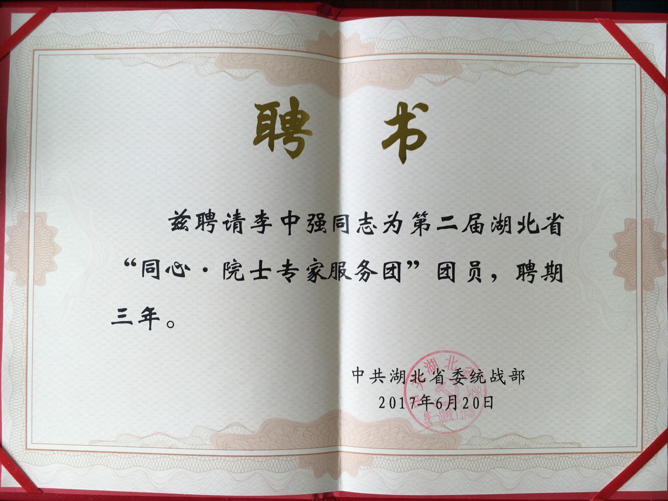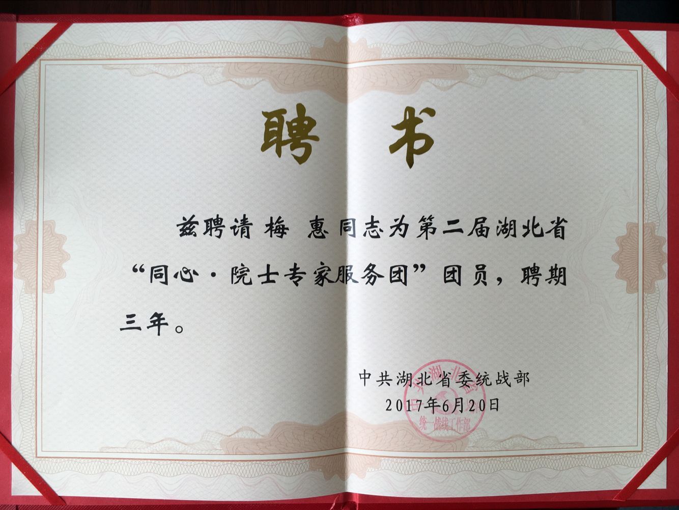 6月14日,中共湖北省委统战部下发《关于聘请第二届湖北省“同心·院士专家服务团”名誉团长、名誉副团长及团长、副团长、团员的通知》,公司李中强教授、梅惠副教授光荣入选。