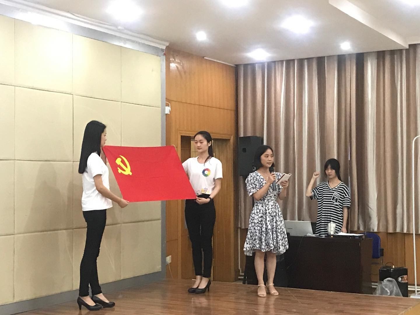 在优秀员工导航员代表李梓桐同学的发言中,她介绍了何为党员导航工程,并表示要做好一个优秀的共产党员需要坚强乐观的态度、努力进取的决心和奉献他人服务他人的觉悟。随后,各党支部便开始了他们独具特色的风采展示。地理科学党支部的《中国梦》激昂澎湃,地理信息科学党支部通过小品《入党那些事儿》带领全体党员重温了光荣而严肃的入党流程,人文地理与城乡规划党支部为祖国奏响了《七月赞歌》,环境工程党支部用幽默诙谐的方式让党员们明白了《员工党员的意义》。各个党支部的成员都用自己的方式展现了他们对党的理解、对党的热爱、对党的拥护。最后,教工党支部书记朱恒带领全体党员重温了入党誓词。就像主持人徐明岩说的那样:“我们没有完美的共产党员,我们有的是不断进步、不断完善自我的党员。”