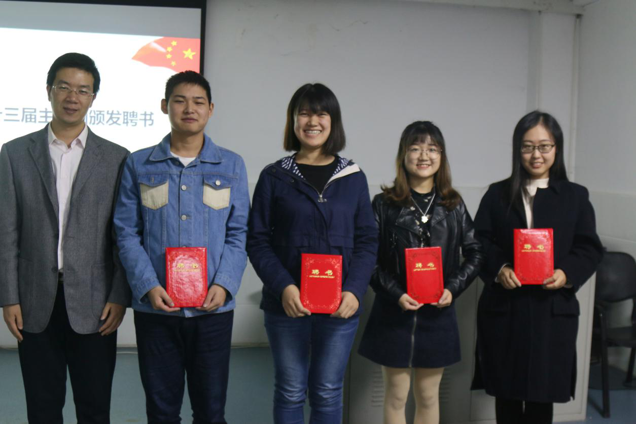院团委书记王文锋老师宣读第十四届员工主席团任命书,之后,四位第十四届员工主席团代表:院青传副主编李清韵、院员工会副主席杨一伦、院社联主席聂梓源、院志协主席李红润先后发言。