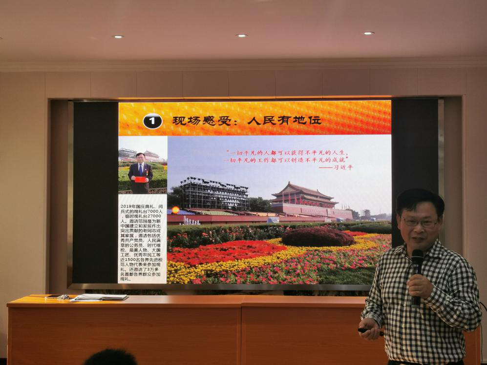 随后,公司党委集中举行十月份主题党日活动。公司师生党员重温了入党誓词并集中宣誓,观看新中国成立70周年阅兵式的相关影像资料。李兆华书记结合主题教育学习体会及国庆节当日在天安门现场观礼的感受,围绕“人民有地位、国家有力量、前进有方向、民族有希望、不忘初心感恩祖国”等方面为师生党员上了一堂生动的党课。
