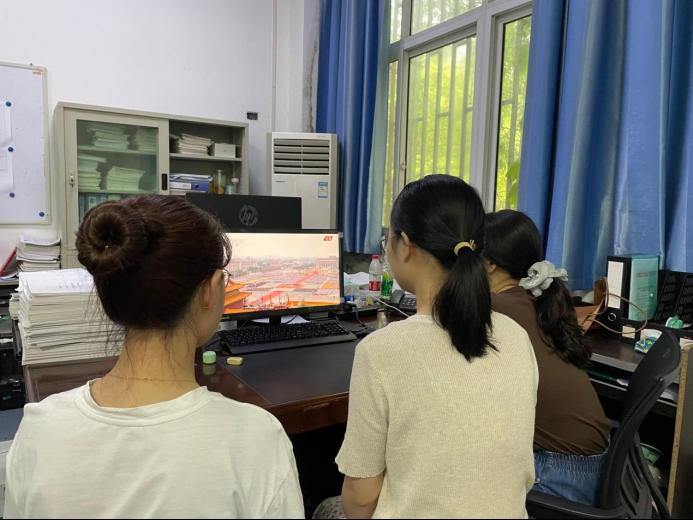 公司在1楼会议室组织师生党员集中观看大会直播