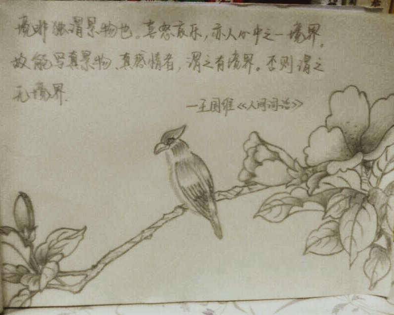 “以我观物,物皆以我为颜色。”她一字一顿地说道。看到李婷画画的手稿,我们再一次被这个从小就学画,骨子里深爱古典文化的女子折服。“很喜欢画花鸟画,特别是《人间词话》里面的那些,我和古生物科研所的缘分,也正所谓‘众里寻她千百度,蓦然回首,那人却在灯火阑珊处’吧!”