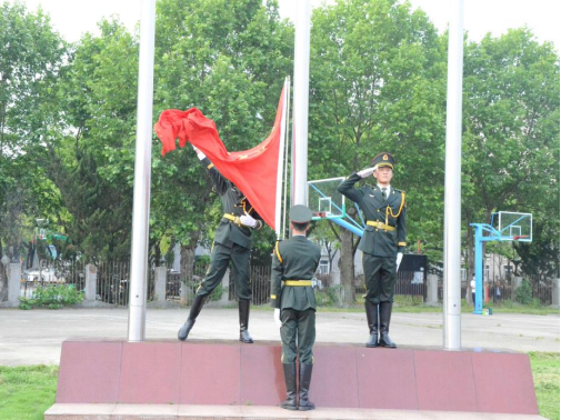 早上7:00,升旗仪式正式开始。国旗护卫队迈着铿锵有力的步伐,正步护送国旗至升旗台,全体人员面向国旗肃立行注目礼。在雄壮的国歌声中,迎着第一缕晨光,全体师生齐唱国歌,鲜艳的五星国旗缓缓升起,迎风招展。