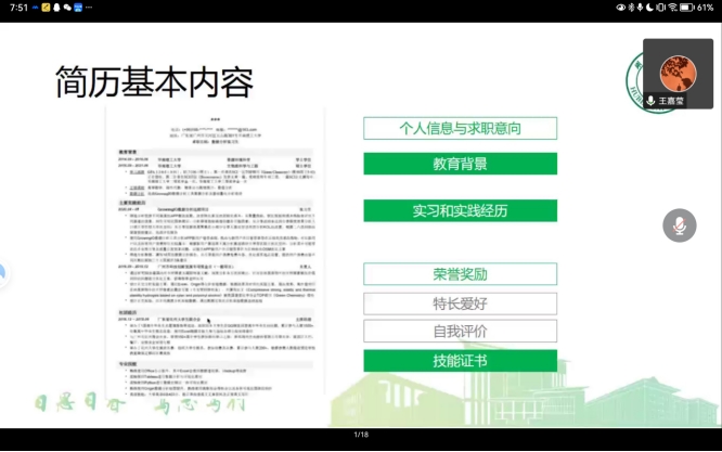讲座中,王嘉莹老师首先以“什么是职业生涯规划”这一问题引发了同学们的思考和讨论,带领同学了解了职业生涯规划的含义。然后,讲述了如何进行职业生涯准备和生涯决策方法,并针对同学们的疑问进行了耐心细致的答复。最后,王嘉莹老师为同学们讲解了提升求职技能,包括简历制作、个体面试、群体面试等内容,帮助同学们提升求职的能力。