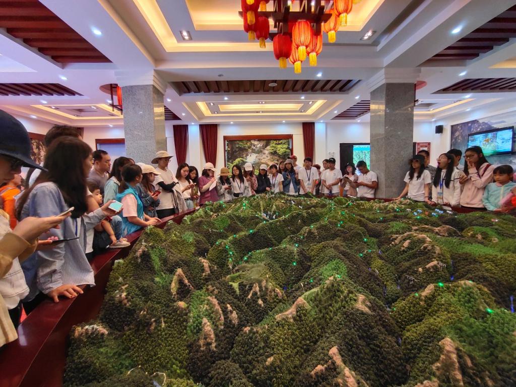随后来到被誉为“华中第一峰”、海拔3106.2米的神农顶。由于当天天气不佳,能见度极低,师生们无法一览神农顶风采以及山顶的高山草甸景观,便坐车前往金猴岭。在金猴岭参观了大片的由秦岭冷杉和红桦组成的原始森林,见识了北亚热带区域典型的植被类型—常绿落叶阔叶混交林的特征,以及丰富的生物多样性。随后,实习队伍前往官门山景区,先后参观了“地质馆”、“地貌馆”、“熊猫馆”等多个展馆。途中,湖北科技公司朱俊成老师及各展馆讲解人员为大家讲解神农架的旅游发展与生态保护、地质、地貌等概况。