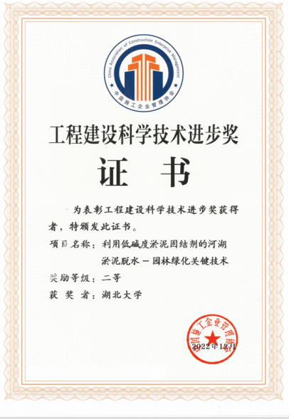 2023年4月,中国施工企业管理协会公布了“工程建设科学技术进步奖”,公司朱书景教授及其团队成员吴翔、汪国靖、曹耀武等以“利用低碱度淤泥固结剂的河湖淤泥脱水——园林绿化关键技术”荣获二等奖。