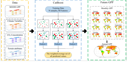 在气候急剧变化的今天,预测未来全球GPP在不同排放情景下的变化情况是非常有必要的。然而,由于基于过程的模型的复杂结构和参数,其在预测未来GPP方面表现出较大的不确定性。为此,本文使用MODIS GPP数据、气候变量数据、大气CO2浓度数据以及地形特征数据,基于机器学习建立了数据驱动模型来预测未来不同情景下的全球年度和月度GPP,分析不同环境变量对GPP的影响,并探讨了未来不同情景下GPP的时空变化情况。论文研究表明,未来全球GPP变化随着情景模式水平的提升而逐渐增大,预计2100年的全球年度GPP在SSP1-2.6, SSP2-4.5, SSP3-7.0, SSP5-8.5情景下分别为115.122 Pg C、116.537 Pg C、117.626 Pg C、以及120.097 Pg C。环境变量中对GPP影响最大的是太阳辐射,大气CO2浓度也对GPP有着一定的影响。从空间分布看,北半球中高纬度地区的GPP在未来可能会有所增加,而赤道附近等低纬度区域的GPP则可能会减少。