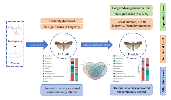 草地贪夜蛾Spodoptera frugiperda是世界上最重要的入侵和破坏性害虫之一,造成作物减产和经济损失。前期已研发出针对此虫的高效杀虫剂—植物源杀虫混剂(茶皂素:苦参碱=10:1),为了更全面的评价该混剂对草地贪夜蛾的影响,本文探究了亲代成虫暴露混剂后,对F0、F1两代草地贪夜蛾的生物学和种群参数以及体内伴生细菌的影响。该研究揭示了继代效应使草地贪夜蛾的适合度权衡趋于进化中性,而相关伴生细菌的改变是草地贪夜蛾对杀虫剂适应机制的潜在驱动因素。该项研究获得国家自然科学基金和中国博士后科学基金等项目的支持。