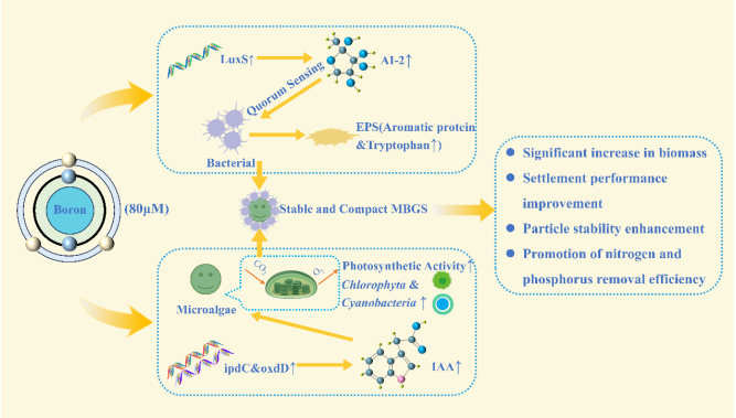 微藻-细菌颗粒污泥(MBGS)是一种高效、节能且环境友好的污水处理技术,能够通过微藻和细菌的协同作用实现污染物去除和资源化利用。然而,藻类与细菌之间的相互关系易受环境变化影响,导致系统稳定性下降。本研究聚焦硼元素在MBGS系统中的作用,发现硼通过促进细菌自诱导因子(AI-2)的分泌,激活群体感应(QS),显著提高细胞外聚合物(EPS)的生成量,增强了颗粒污泥的结构稳定性和沉降性能。同时,硼调控藻类吲哚-3-乙酸(IAA)的水平,提高光合作用效率,使绿藻门和蓝藻门的丰度显著增加,从而优化了氮、磷等污染物的去除效率。在最优硼浓度(80 µM)下,MBGS系统表现出最佳性能,包括显著提高的氨氮(NH4+-N)和磷酸盐(PO43--P)去除效率,以及降低的氧化应激水平(以超氧化物歧化酶(SOD)活性减少为标志)。硼通过调控藻类与细菌的信号通信,强化了它们的协同作用,为提升MBGS技术在污水处理中的稳定性和效率提供了理论依据。这一研究结果展现了MBGS技术在实现碳中和与资源回收方面的巨大潜力。本论文365英国上市集团为第一完成单位,2021级硕士生万仁辉和2023级硕士生莫凡为共同第一作者,365英国上市集团胡惠秩副教授为论文通讯作者。该项研究得到湖北省自然科学基金的支持。