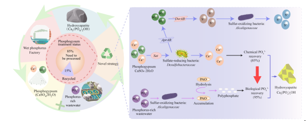 面对全球磷资源短缺的问题,从富磷废弃物中回收磷资源引起研究者们的广泛关注。造纸废水中含有高浓度磷酸根(PO43-,约200 mg/L),是一种极具潜力的磷回收来源。磷石膏(~95% CaSO4·2H2O)作为湿法生产磷酸(H3PO4)工业的副产物,含有0.1-1.8%的P2O5和Ca2+,可为钙磷沉淀提供原材料。面对造纸废水中存在高浓度硫酸盐抑制磷酸根回收的技术难题,本研究创新性地提出了一种从造纸废水中回收PO43-的新策略:通过利用硫循环细菌调控硫酸盐的转化,耦合磷石膏的循环利用形成羟基磷灰石(Ca5(PO4)3OH),实现磷的高效回收。研究表明,投加0.1 g磷石膏即可实现95%的PO43-回收率。首先在化学作用下磷石膏水解产生的Ca2+通过吸附作用启动初始磷回收;后续在生物作用下通过硫酸盐还原菌(Desulfobacteraceae)和硫氧化菌(Alcaligenaceae)破解了硫酸盐抑制难题,同时通过碱度提升和多聚磷酸盐释放为结晶阶段创造条件;最终持续释放的Ca2+与PO43-结合形成高纯度的羟基磷灰石。基于羟基磷灰石在湿法磷酸生产工艺中的原料地位,本研究构建了磷资源闭路循环体系。为工业废水磷回收提供了兼具环境友好性和经济可行性的解决方案。