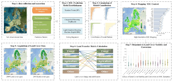 高分辨率土壤有机碳空间分布信息是精准评估区域土地利用变化对碳循环影响的关键。研究团队创新性地构建了投票回归器集成模型,融合了随机森林、CatBoost和LightGBM三种机器学习算法的优势,首次实现了对欧洲23个国家30米分辨率土壤有机碳的高精度时空制图,并定量揭示了大陆尺度不同土地覆盖类型转换对土壤碳储量的差异化影响。