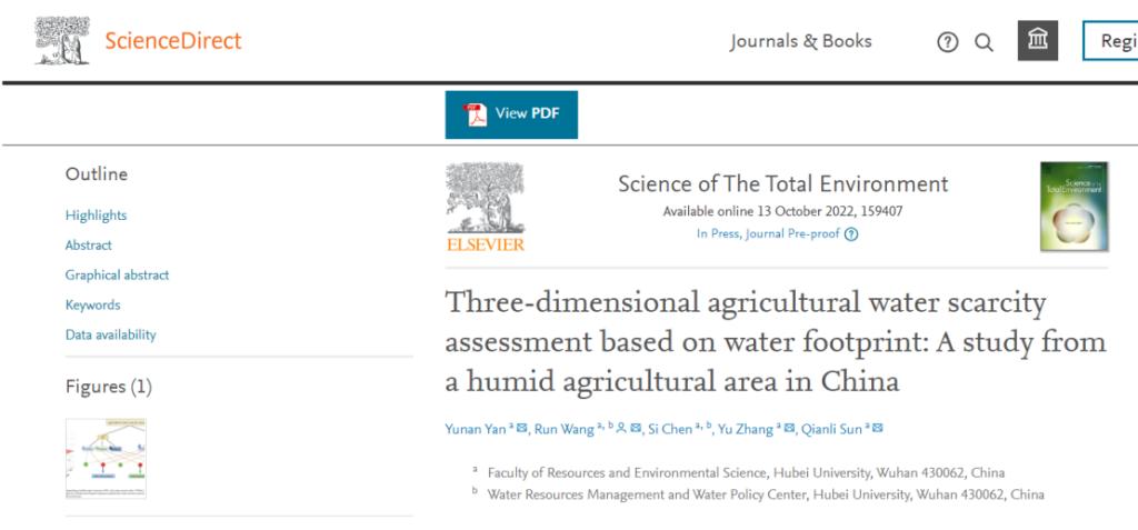 近日,公司王润教授及其研究生严宇男在环境科学一区top期刊《Science of The Total Environment》发表了题为“Three-dimensional agricultural water scarcity assessment based on water footprint: A study from a humid agricultural area in China”的研究论文。