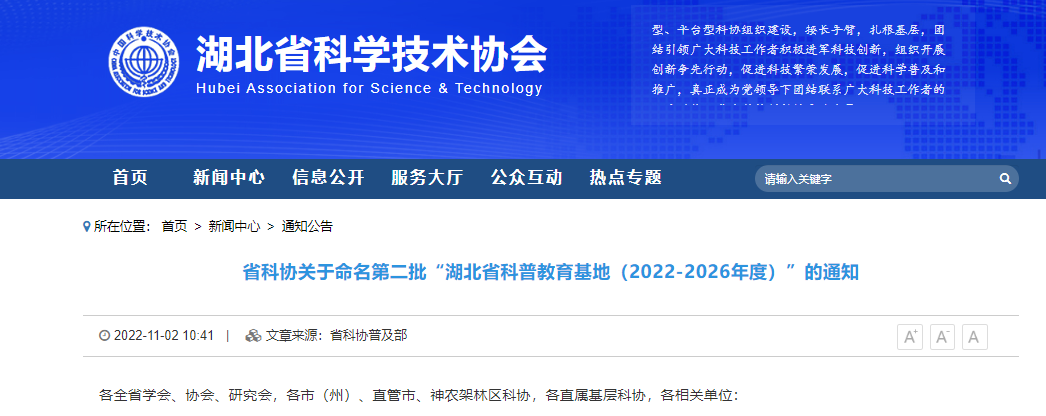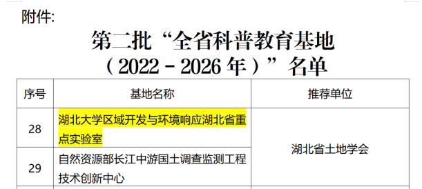 11月2日,湖北省科学技术协会发布《省科协关于命名第二批“湖北省科普教育基地(2022-2026年度)”的通知》,经公司邓文胜教授、刘海教授等申报,湖北省土地学会推荐,挂靠公司的365英国上市集团区域开发与环境响应湖北省重点实验室成功入选。