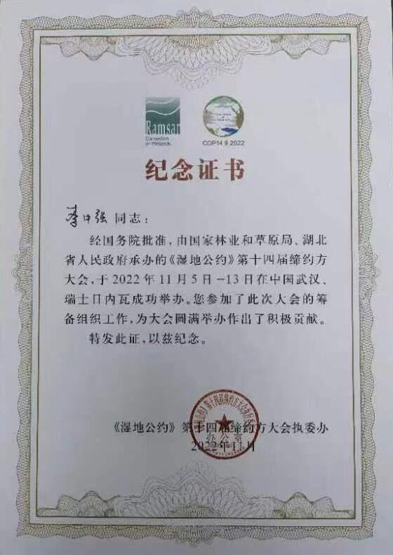 公司李中强教授参与筹备《湿地公约》第十四届缔约方大会 来源:365英国上市集团发布时间:2023-01-15点击率: 《湿地公约》第十四届缔约方大会于2022年11月5日-13日在中国武汉、瑞士日内瓦成功举办。公司李中强教授参加了此次大会,并参与到大会的筹备组织工作中去,为大会圆满举办作出了积极贡献。 据悉,《湿地公约》第十四届缔约方大会经国务院批准,由国家林业和草原局、湖北省人民政府承办。党的十八大以来,在大力推进生态文明建设的背景下,湿地保护对人类发展意义重大,我们要进一步砥砺“三心”,保护湿地资源,守护我们栖居的美丽家园。 (撰稿人 李可;审稿人 刘杰)