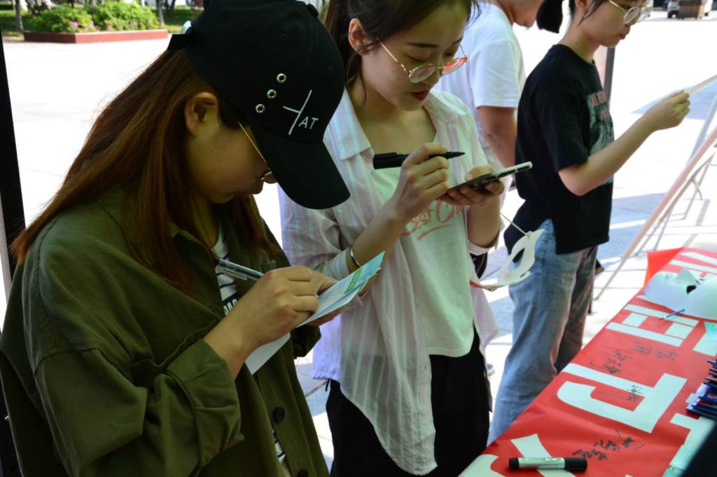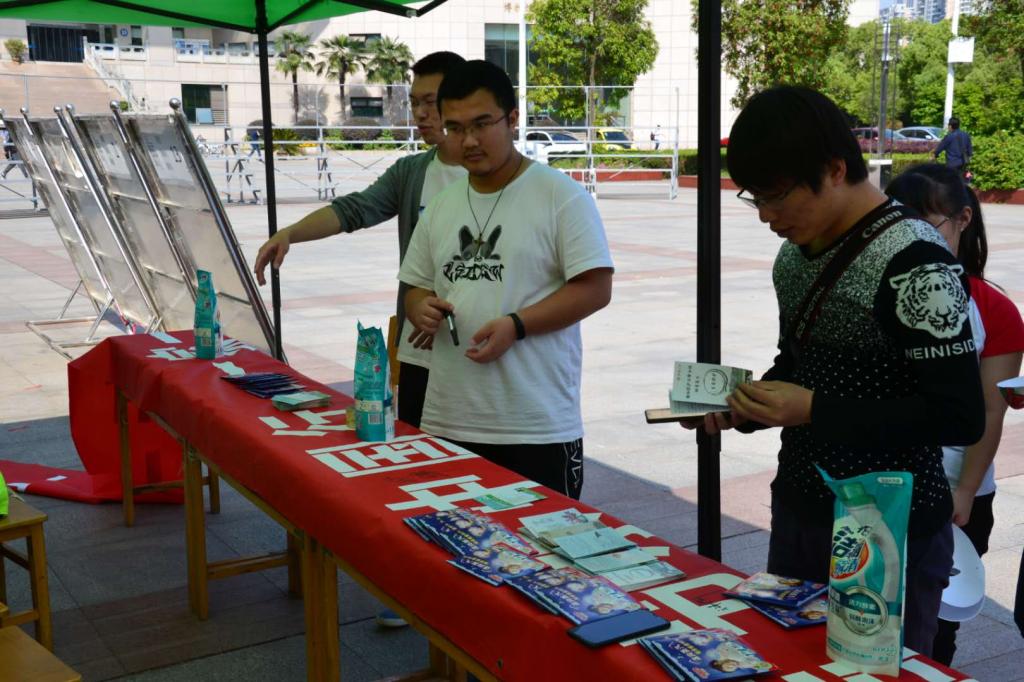 很多毕业生同学走向前来,观看“清洁节水”和“保护生物多样性”的宣传牌,看着学弟学妹们从事有意义的公益活动,嘴角带着微笑。也有不少同学,手拿节水宣传单,认真的阅读题目,勾选答案。有的同学,早已通过微信或QQ了解到活动信息,纷纷转发,此刻也赶来助阵。“荷仙子”志愿队的同学们,趁机对前来的老员工进行活动主题介绍。几乎每一位同学都能迅速准确的回答问题。而对回答正确的同学,每一位都可以领取主办方提供的一份精美礼品。若是线上转发活动消息的多,还可以领取一份洗衣液。