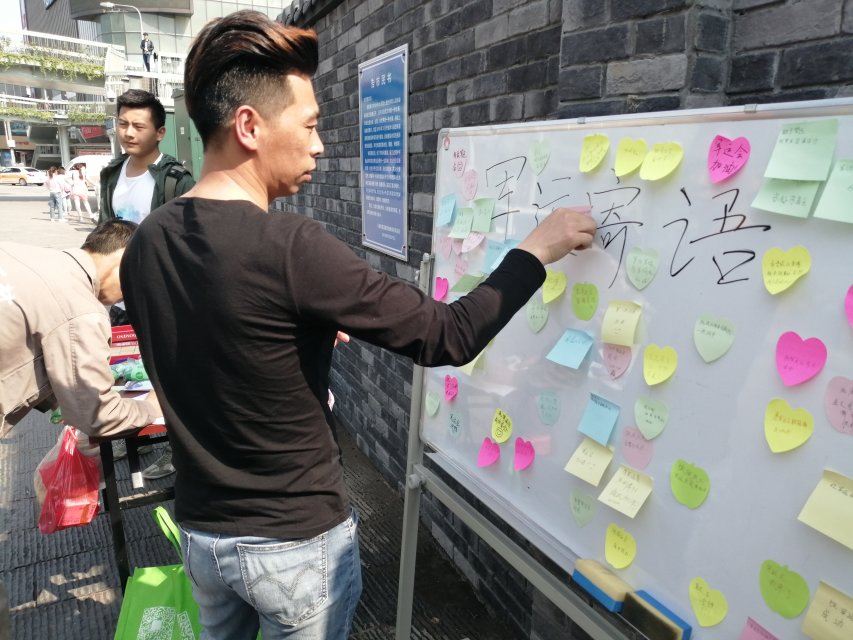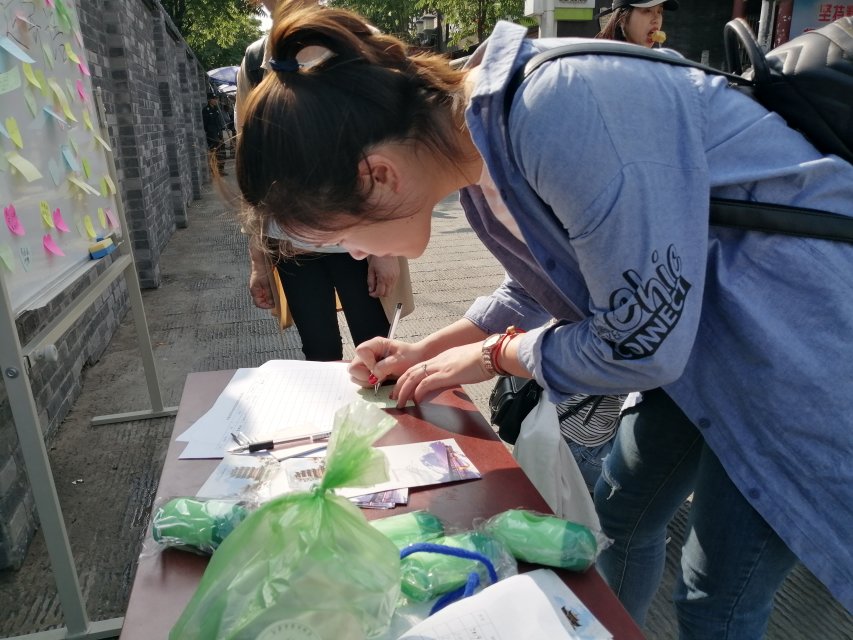 此次“军运宣讲会”在宣传军运知识的同时,加入了垃圾分类的游戏环节。参与者将写有不同垃圾名称的乒乓球投入到相对应的厨余垃圾、可回收垃圾、不可回收垃圾的桶中,通过这种方式宣传垃圾分类的知识,进而鼓励民众在日常生活中实践垃圾分类处理。最后,居民和游客纷纷在黑板上写下了对武汉和军运会的期待。