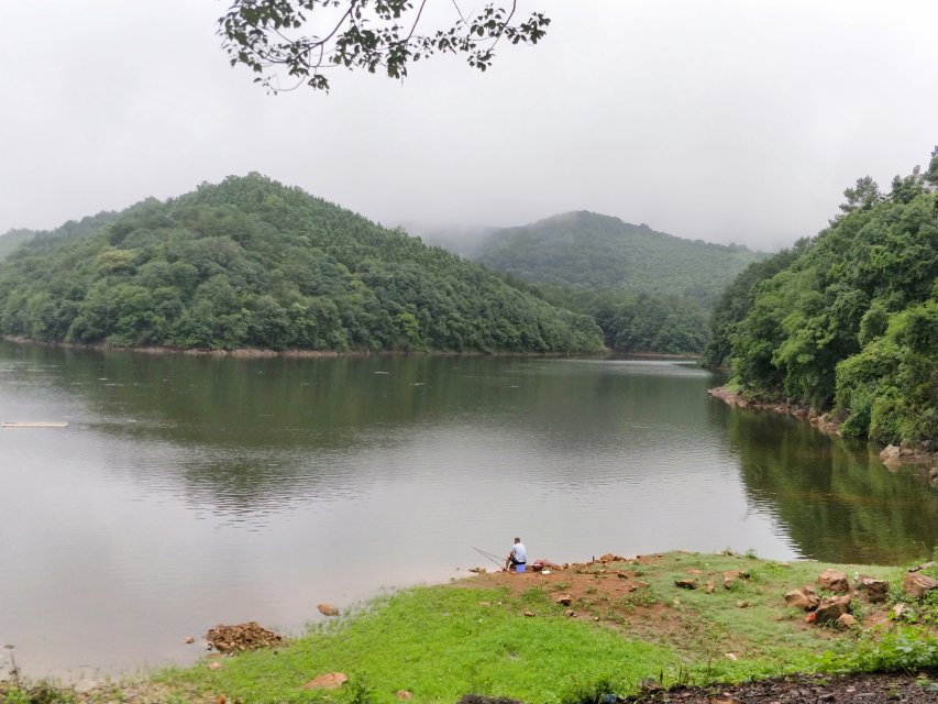 从寨子山上下来之后,来到了九龟湖休闲垂钓中心,细雨过后的九龟湖泛着粼粼的波光,倒映在水中的山峦被雾气萦绕着,仿佛人间仙境一般。站在九龟湖的堤坝上,极目远眺,能够看到点缀在一片绿田之中的双泉村,在青山绿水的映衬下就好像陶渊明笔下的桃花源,那里就是我们明天的目的地。