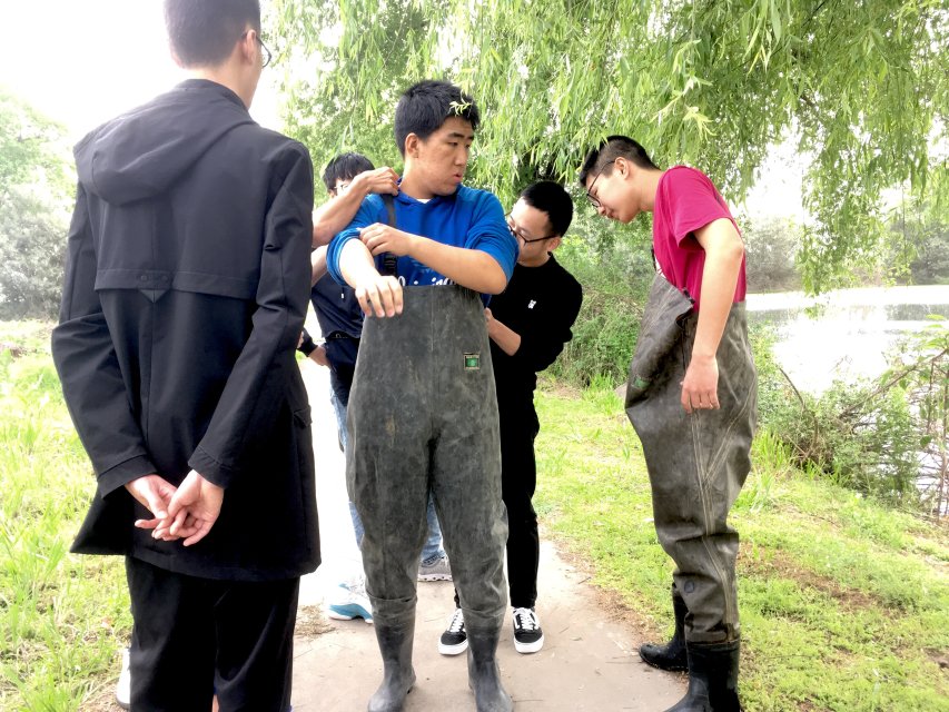 紧接着志愿者们来到了雁桥,由于水位上涨,雁桥的浮岛难以上岸,志愿者们只能留到下次再进行,便前往了小木屋。此处浮岛长势迅猛,根茎粗大,大多数已经损坏,志愿者们将浮岛捞起后重新捆绑下水。因为天逐渐变热,沙湖水也开始散发着一股臭味,而且水里很脏乱,蚊虫也随处可见,志愿者们顶着这样恶劣的条件空手上阵,甚至部分人手上都出现了一些伤口。在修浮岛过程中,沙湖里的很多行人向志愿者们咨询与浮岛有关的问题,志愿者们向行人们简略介绍了浮岛的基本情况。此外,有一位初三员工也加入了志愿者的队伍中。整个下午,志愿者们各司其职,一直在忙碌。