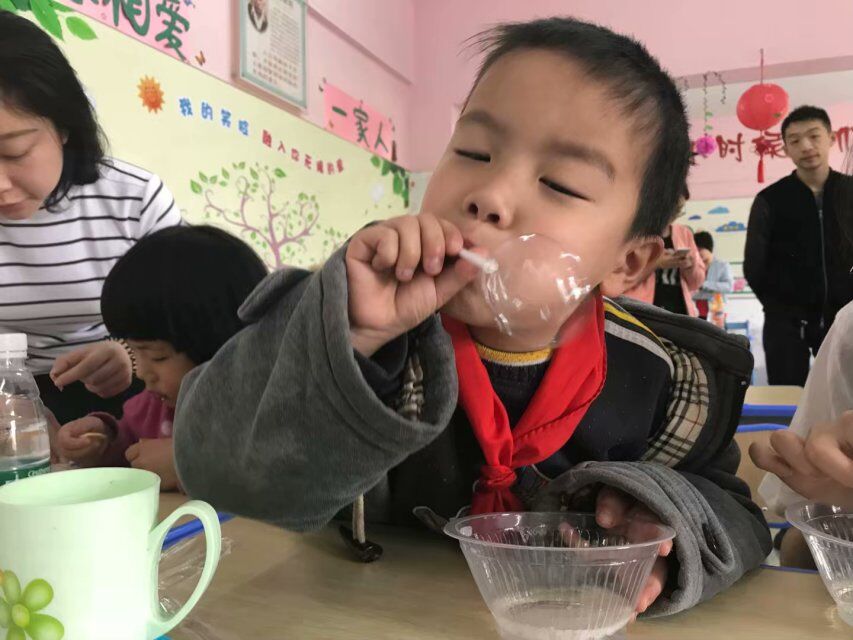 当天下午一点,活动参与人员经院里集合后,在负责人赵政印带领下踏上了逾时一个小时的车程,到达目的地——武汉市救助管理站。在老师的引领下,志愿者先孩子们一步进入了教室。整个活动有三个环节,首先是要提起孩子们的兴趣,志愿者们用准备好的小苏打自制泡泡水,给每个孩子都分发两支吸管,让志愿者引导着孩子去吹出彩色的泡泡,让他们去领略这世上的美好。有的孩子吹得急了,总是失败,在志愿者耐心指引下,终于成功,顿时开了笑脸。