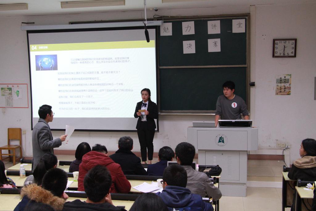 作为中国信息社会的基础设施,互联网本成为我们生活中不可或缺的一部分,“互联网+”带来的影响则更加深远。举办此次“互联网+”主题魅力讲堂活动,增加了同学们对我们身边互联网的了解,提高了同学们对互联网的兴趣。在比赛的最后,课堂演练协会指导老师庞静总结道:“三尺讲台,最重要的是要言之有‘物’,希望在座的每一位都能从参赛者的课演中汲取到知识”。(通讯员:邓紫薇 图片来源:袁毅)