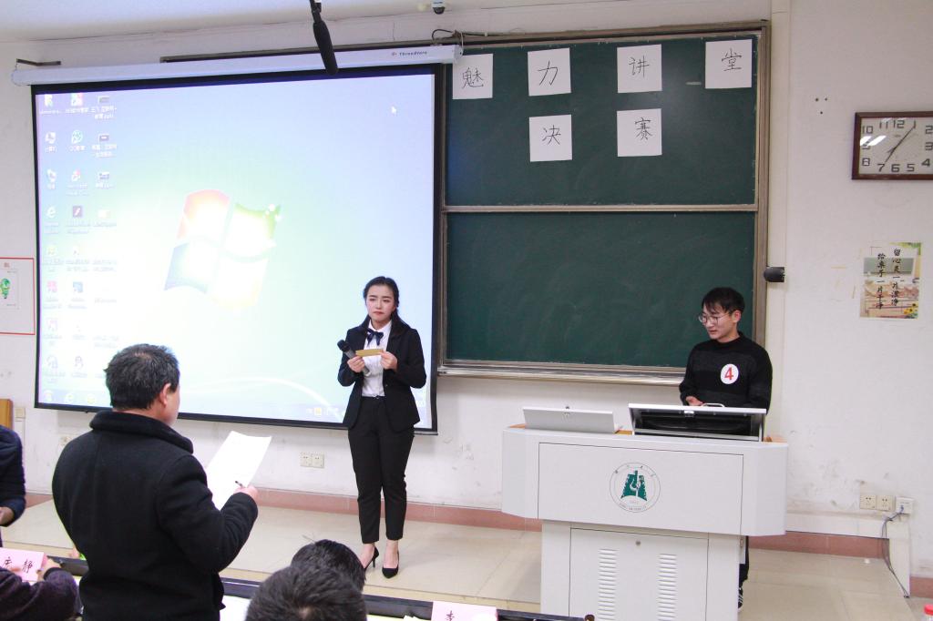 经过初赛的激烈角逐,最终有六位同学成功跻身决赛。决赛要求选手们在限定时间内借助黑板、PPT等多媒体进行主题讲课,由评委进行现场点评和打分。首先上场的是来自历史文化公司的曾庆文,“互联网传播了低俗文化,也给予了我们优秀的学习资源。”他从互联网文化的利与弊两方面出发,提出的“糟糕的孩子变得更糟糕,优秀的孩子变得更加优秀”观点则引起了在座听课者的深思。张程老师在点评时说道:“一号选手在演讲技巧和仪表仪态方面表现地非常好,从里到外透露出强大的自信,讲课具有逻辑和层次性,内容也紧跟着时代的步伐。”
