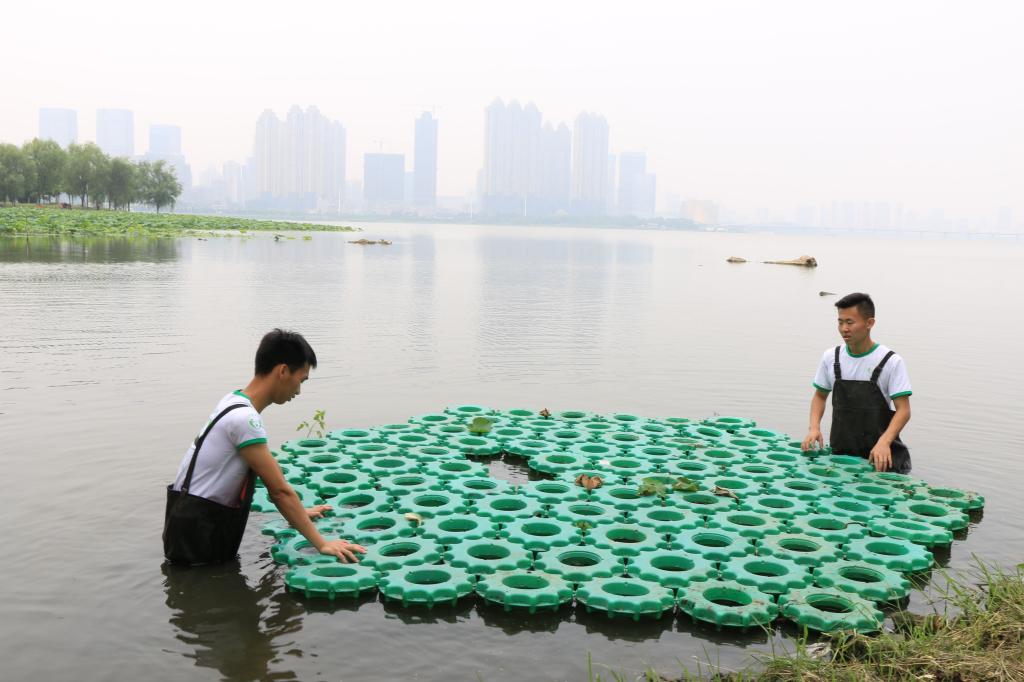 “人工生物浮岛技术是将挺水植物或喜水的陆生植物移植到浮体上栽培,通过植物根系的截留、吸收、吸附等作用削减水中的氮、磷等营养物质,降低水体富营养化程度。”此次活动指导老师、资环公司教授卢进登介绍,“此技术也能为水中微生物提供很好的生长环境,发达的植物根系为微生物的生长提供了很好的环境,通过微生物降解有机物、脱氮等,又可以进一步净化水质,同时也可以营造美丽的景观。”