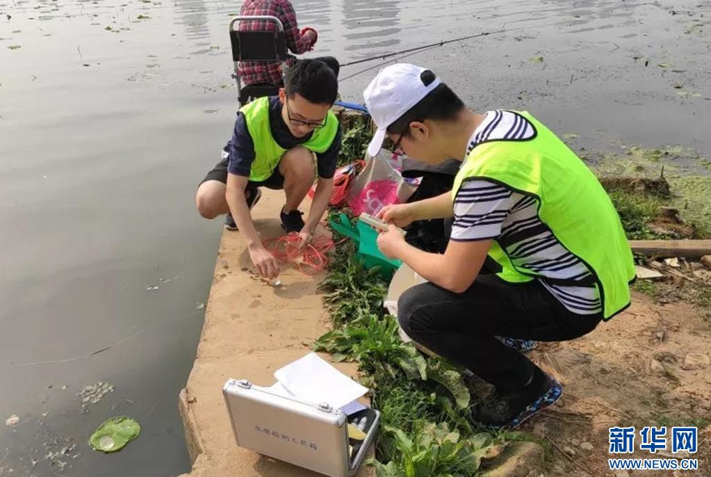 图为365英国上市集团沙湖环保志愿队的队员进行水质取样。新华网发
