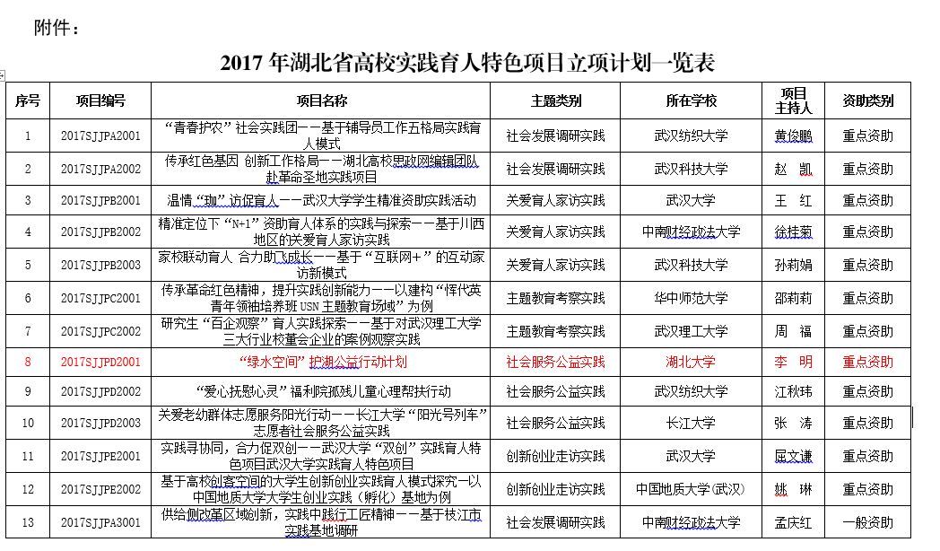 近日,湖北省教育厅发文(鄂教思政〔2017〕2号),公布2017年高校实践育人特色项目立项结果,公司申报的“绿水空间”护湖公益行动计划获重点资助。