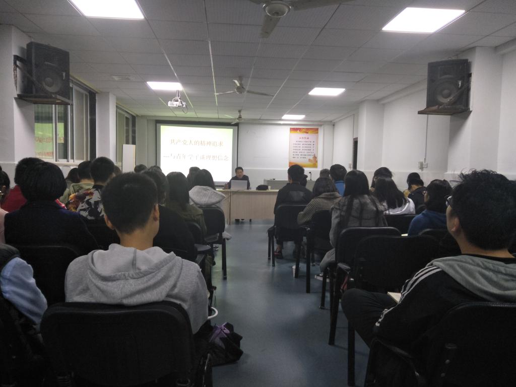 郭劲松老师以“什么是大学毕业?”这一问题开场。在同学们热烈地讨论之后,郭劲松总结道:“只有拥有自己的理性思辨、有理想有信念的人,才能被称作合格的大学毕业生。”之后,他详细地阐释了理性、理想和信念三者的关系。在谈及信念时,郭劲松结合自己丰富的学术交流经历,和研究课题时所作的充分的调查,用轻松活泼却饱含哲理的话语,解释了“信念”作为一个人精神向导、精神动力和精神支柱的巨大作用。会中,郭劲松又将个人的信念升华为对中国共产党的信仰,对马克思主义的信仰。他既讲述了无产阶级革命的宏大历史,也谈到自己的父亲作为一名老共产党员,对党组织的忠诚。之后,郭劲松又问道:“为什么不论是老一辈革命者,还是当代社会主义建设者都对共产主义有如此坚定的信仰呢?是什么让他们矢志不渝坚持社会主义道路呢?”提出问题后,郭劲松并没有立刻回答,而是列举了马克思在世界级“千年伟人”评选中三次以榜首当选的事实。他说:“正是因为马克思主义的科学性、真理性,才使无数人为之奋斗终身!”最后,郭劲松向同学们提出了“坚定理想信念,坚持知行合一”的要求,希望同学们可以严格要求自己,积极向党组织靠拢。