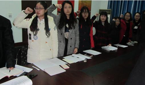 在转正申请环节,11位申请人按照程序宣读申请、之后与会党员进行了讨论、正式党员不记名投票。党支部成员都十分珍惜本次机会,对申请人进行充分讨论。申请人也对他人评价虚心接受。“鲁飞宇同学是我的同班同学,也可以说是我的半个室友,他品学兼优……我同意他如期转正”倪超同志这样说道。在接下来的评价讨论中,“半个室友”一词频频出现,使得原本严肃的大会变得活跃起来。 最后,在党员陈爽同志的带领下,大家共同宣读了入党誓词。