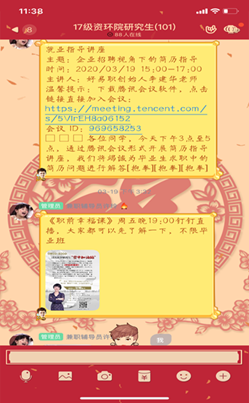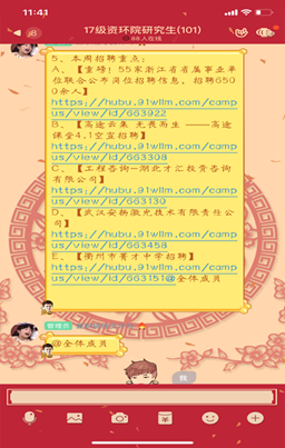 公司研究生会于2019年9月开始,利用群聊的便利性,配合院辅导老师在2017级资环研究生群在线上开展就业、创业活动,主要是为17级的准毕业生们提供相关就业、创业信息与指导,为即将迈向社会的准毕业生们顺利就业规避风险、保驾护航。